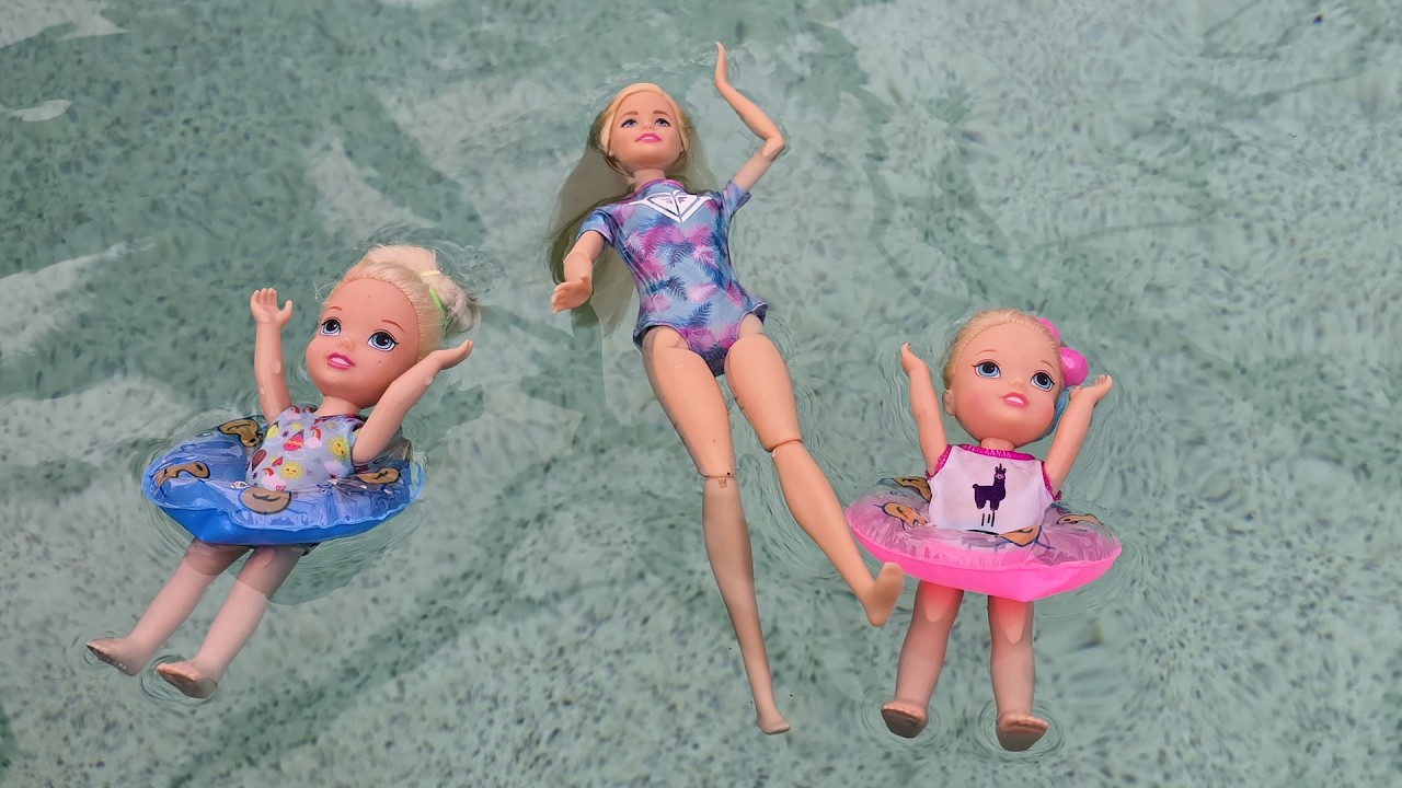 Watch me guys. Okay, Benjamin, calm down. And breathe. Slice. Swim. Swish. Cut. Pizza. Cut. Kick. Legs. Some swimming. Pizza cut. Huh? What is that over there? Are those toys? Let me go see what they are. I made it. And a these are so cute. A little sea turtle, a little ducky, a shark, and a pink flamingo. They all seem to have some sort of flappers. It moved a bit. Wait a second. Can they swim?