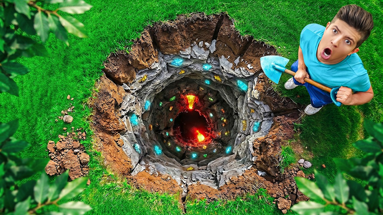 Nobody knows what's actually at the center of the Earth. Oh, it's dinosaurs, right? We're racing through caves, mine shafts, and even lava. But we're starting with mass shovel. Oh, wait. Listen, listen, listen. You can hear the crust fight back. Oh, he's going in. THOSE ARE ROCKS. ROCKS AND CLAY. This is tough stuff. Why couldn't you have PICKED A BETTER SPOT of the earth to start digging? Time to punish this crust. I was looking for this. Safety first. There's a whole tree in there, dude. Grandma Willow was buried in here. Oh.