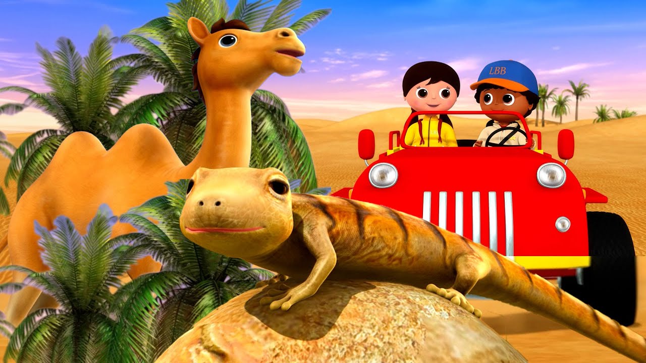 Going to the desert, we're going to the desert. We're off to the hot, dry, and sandy desert. What will we see Sand and cactuses and sand in our hair. We'll go in a jeep and see animals such as lizards, hares and camels. Going to the desert, we're going to the desert. We're off to the hot, dry, and sandy desert. The temperature is 100° Fahrenheit, although it's much cooler late at night. Wrap a headscarf to protect yourself from the sun and sand.