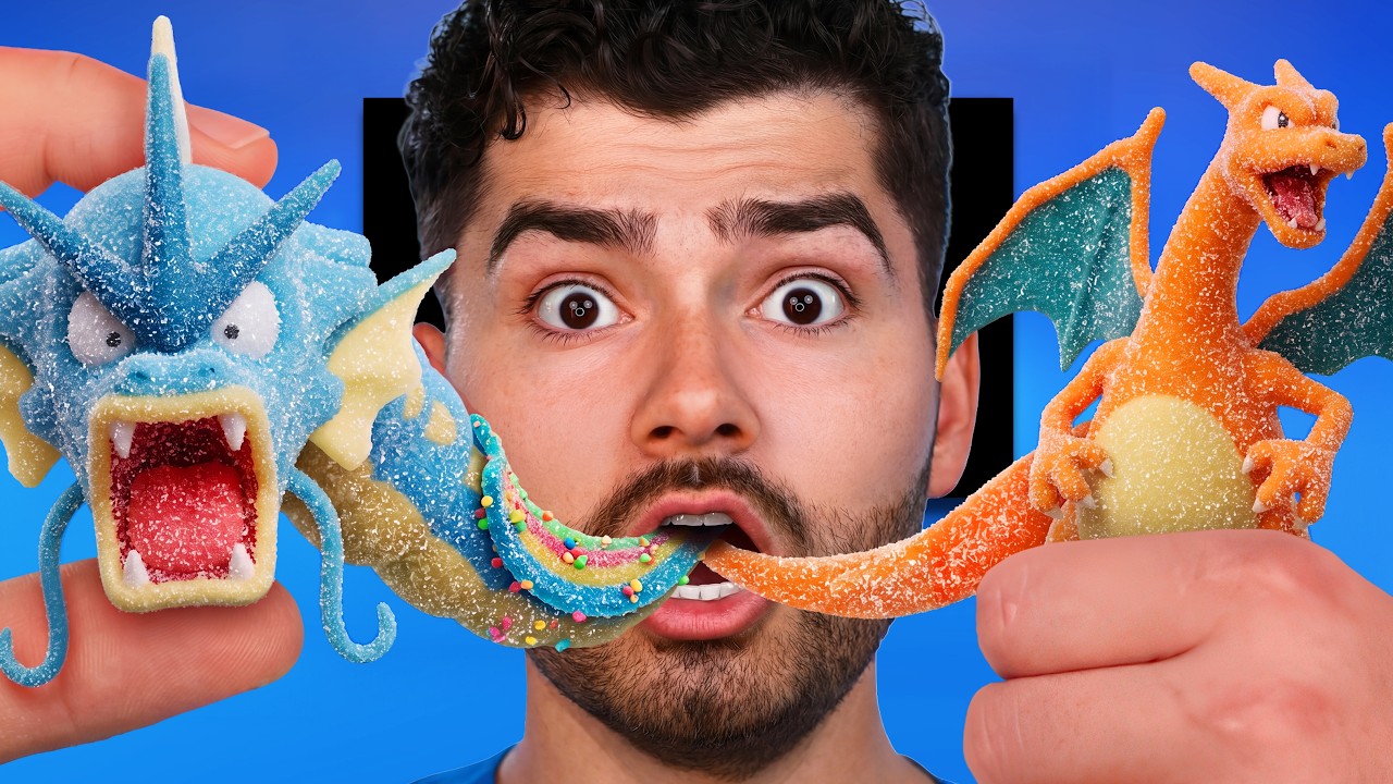 HIT ME. Much better. Thanks, Squirtle. I just remembered that GRASS IS WEAK TO FIRE. Let's get fired UP WITH SPICY K-POP RAMEN. It's Roomie Robin. If you haven't seen my K-pop DEMON HUNTER VIDEO YET, MAKE SURE TO CLICK UP HERE. Come out of that fire. SO SPICY. WOO! IT CREEPS UP ON YOU. That took care of Bulbasaur. Oh no, it's Raichu. He's going to USE BODY SLAP. WOO! HUH? Did part of his tail fall off? WOO! LET'S GRAB IT. WO! It's a LIGHTNING BOLT GUMMY TAIL. It's super stale and crunchy, but it's got delicious banana lemon flavor. Oo, IT'S SUPER SOUR. LET'S FLY TO THE NEXT GYM. WOOHOO! We made it